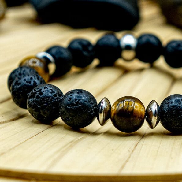 Affirmez votre force intérieure grâce à l’énergie brute de la pierre de lave et la protection rayonnante de l’œil de tigre – un bijou conçu pour équilibrer vitalité et assurance.