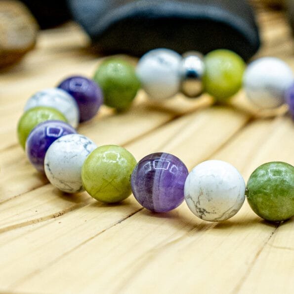 Cultivez la sérénité et l’harmonie avec la Howlite Blanche apaisante, le Jade Vert guérisseur et l’Améthyste spirituelle – un bijou pour équilibre et clarté.